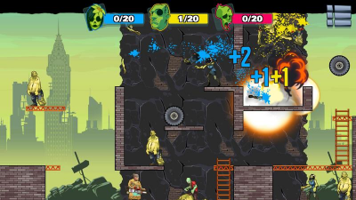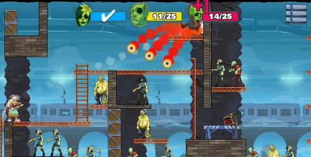 地面以及各种障碍物射击,利用子弹的反弹效果来射杀更多的僵尸,当然每一次射击之前需事先设计好反弹的角度,不可浪费每一粒子弹。
