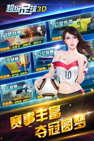 《超级足球3D》是一款真实模拟的动作足球游戏,采用了超写实的人物风格,和绚丽的3D场景与特效,贯穿整个游戏。模拟出真实的比赛场景,让玩家更充分的体会到足球的艺术。游戏主要强调玩家对球员、整个球队的培养,和球场上球员的个性技能、特效