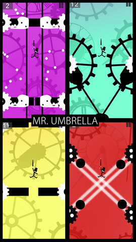 《雨伞先生》Mr. Umbrella是一款休闲益智游戏,在游戏中玩家将操作一个戴着绅士帽拿着洋伞的小人,从高处落下,穿过许许多多齿轮以及它们之间传送的黑带、黑球。点击屏幕即可让小人撑开伞暂停在空中一瞬间,从而避开黑带和黑球,如果一不小心碰上了,小人就会粉身碎骨。