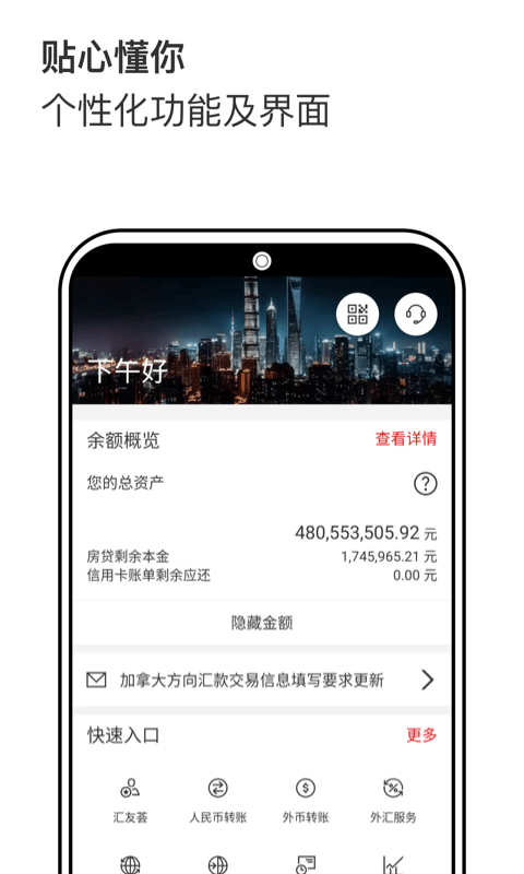 个性化账户服务:通过个性化界面管理借记卡和信用卡,轻松使用存款、转账、外汇、理财、信用卡等多项银行服务。