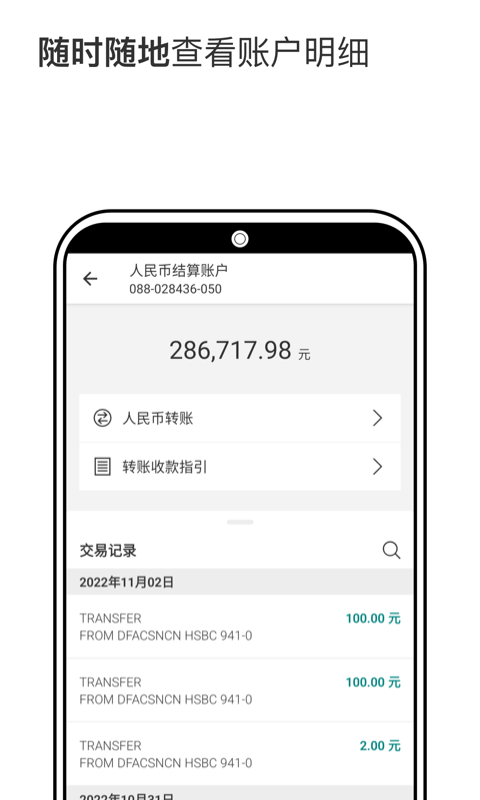 环球账户管理:查看您在中国和其他国家或地区的汇丰同名账户余额,并可进行实时外币跨境转账。