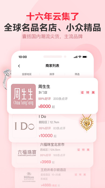 汇聚全球业内商家结婚相关品牌商家,婚宴预订、婚纱摄影、珠宝饰品、婚庆策划、婚纱礼服、婚礼用品、婚车租赁、蜜月旅游等一站式惠购。