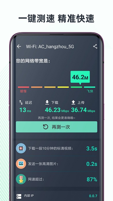 「一键测速」只需30秒,快速、准确获得网速测试结果