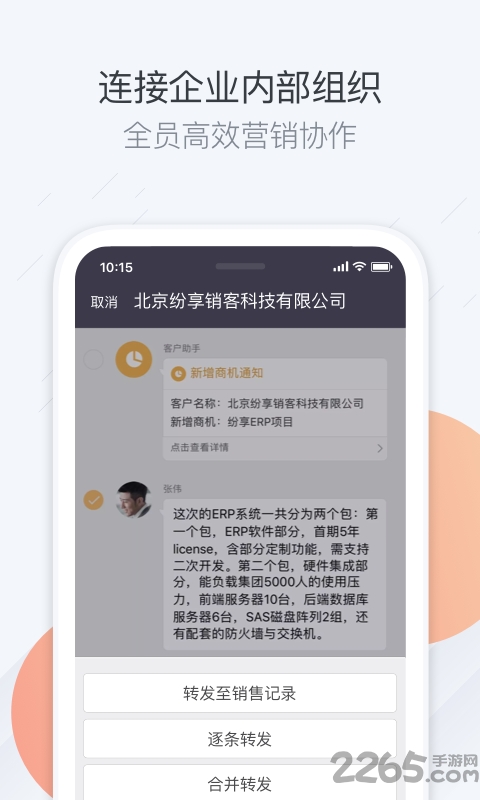 纷享销客内置的即时通讯工具,电脑与手机信息同步,传输文档、图片、录音、分享地理位置。历史信息可查询,员工帐号可管理。
