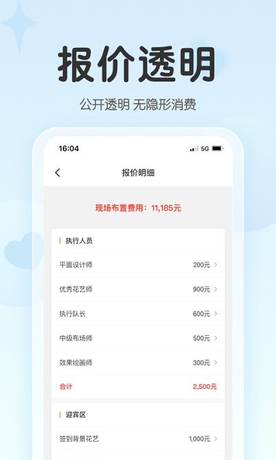 每场婚礼提供透明的婚庆报价明细,所有收费公开透明,绝无隐形消费行为。