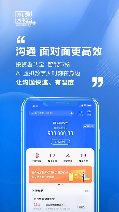 3.沟通,面对面更高效.投资者认定、智能审核,精准推荐服务24小时实时在线,AI虚拟数字人时刻在身边,光大手机银行让沟通快速、有温度.