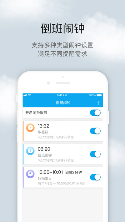 5、倒班闹钟,支持多种闹钟设置。