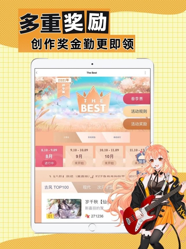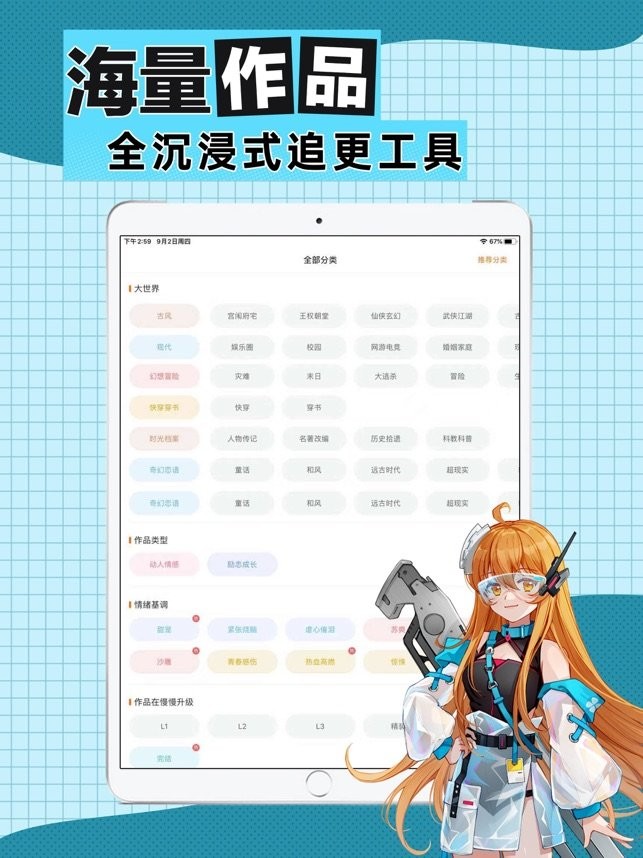 五大作品分区、上百标签分类,网罗当下所有热门题材,APP内海量原创作品让你随心追更!