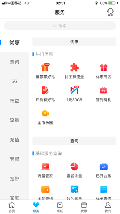 2.支持流量、话费、历史话费、套餐余额、开通业务等信息查询。