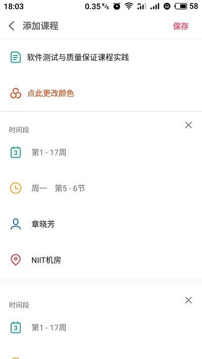 1、课程管理核心模块,支持添加课程名称、地点、教师及备注信息,可设置单双周课程及临时调整提醒。
