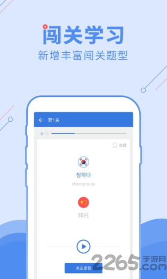 每个学习词语都标有标准首尔口音音频教学,标有对应的普通话翻译,罗马音。更好更准地学习汉语
