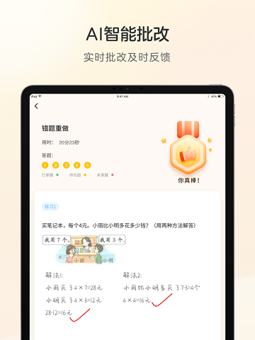 学而思练习本自主研发了智能AI批改引擎,可以实时批改孩子的练习,及时反馈给孩子对错和奖励。我们的识别准确率高达99.9%,远超行业60%识别准确率的平均水平。