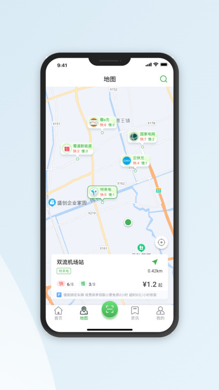 点开APP,即可在首页找到距离自己最近的电动车充电桩;