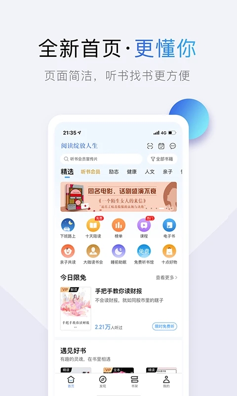 用温暖音频、精彩短视频、精品美文、海量美图多种形式,帮你快速完成自我蜕变,遇见更好的自己。读好书,每晚十点读书,关于好书、美文,、书摘、连载、书店、书单……还有你。听精品有声书、学大咖精品课、与百万书友参与共读活动,海量精彩内容不停更。