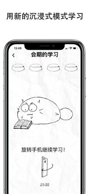 翻转你的手机以免在学习时分心,只有真正学习时,猫才能学习!学习过程结束时,手电筒和轻微震动会通知你 。