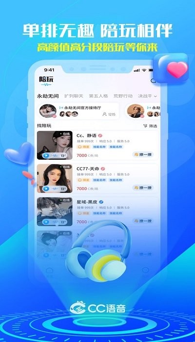 软件是由网易打造的全新语音app,软件中功能多多,玩法多多,可以为用户提供多场景的畅快沟通,还能让你在游戏之外寻找到更多有趣的朋友,给玩家带来不一样的聊天乐趣,感兴趣的不要错过了!