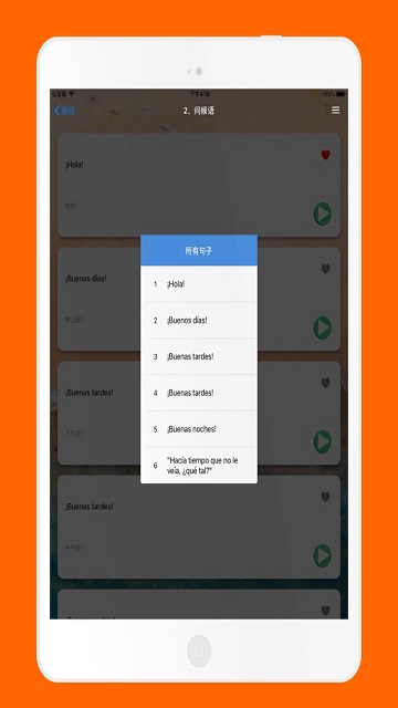 基础西班牙语口语ios版是学习西班牙语的软件。包含较常用的句子以及短语,7大场景让你身临其境般的学习,界面直观,内容丰富,出门旅游就靠它。喜欢的朋友就来2265安卓网下载体验吧!