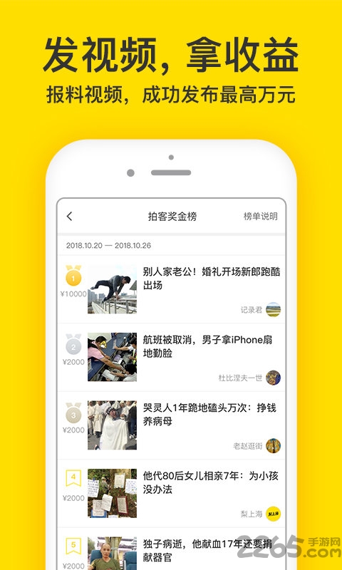 成为拍客,随手拍身边新鲜事报料,视频被采用后24小时内即可收到稿费,视频越火奖励越多