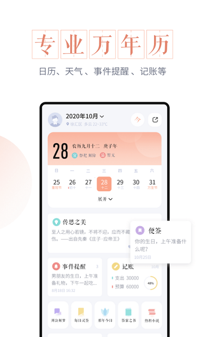 该软件具有传承华最美文化功能,实时给用户推送传统知识,以及文化活动,打造优秀的文化社区,用户随时可在软件上查看黄历、万年历、节假日、农历宜忌等,可对日程进行设置提醒,支持生日、纪念日创建与提醒,方便在日历中查看每日日程安排。
