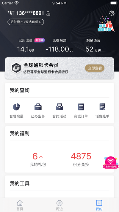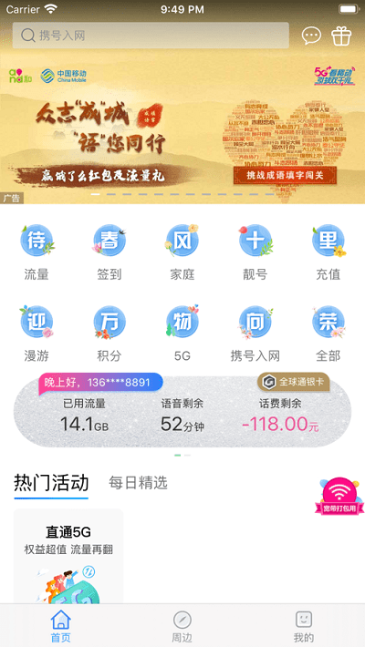 宽带查询、营业厅查询、归属地查询、港澳台漫游资费、国际漫游资费、5G专区等