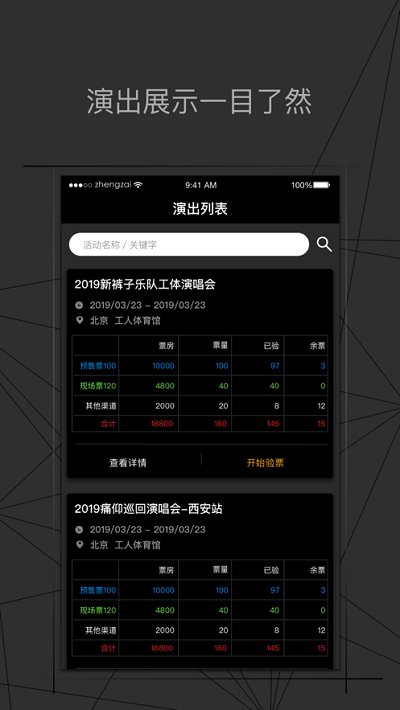 专为音乐人、主办方、live house而研发,为工作人员准备,支持随时查看票据信息,在线扫码验证,支持演出现场管理,售票验票,事务处理安排等服务,大力整合内容、创新服务应用、拓展传播领域、完善用户体验,开辟新型音乐传播渠道,提供演出排期、事务处理,能实时查看售票、验票情况等功能,还有手机验票,让演唱会管理更智能。致力打造具有国际知名度的网络音乐直播平台品牌。