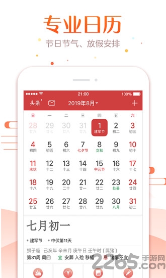 为用户带来的是款非常简单的手机日历,为用户带来的都是最精心的功能。兼备中国传统阴历、黄历宜忌、节日、历史上的今天、当天热点新闻、实时天气等便民信息,可以查询自己的运势,用户每天的运势请看一目了然。并且每日为你推荐最新资讯内容,还可以帮助用户记录重要的日子,让用户不会遗忘任何一个重要的日子.万年历,带给你不一样的生活体验!
