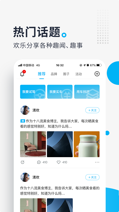 ·可以获取平台推送的各种热门话题,用户就可以掌握到更多的汽车信息