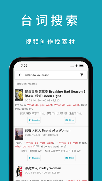 33台词ios版软件是一款十分好用的媒体创作者素材软件,可以通过这款软件进行找素材,通过台词进行搜索相关,还可以收藏找到的词,学习各种英语、日语语法,非常的好用,喜欢的小伙伴赶紧来下载吧!