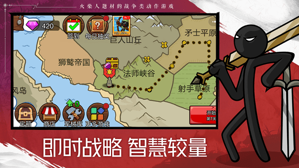 这是一个很好玩的火柴人系列的小游戏,游戏中玩家需要扮演一位君主,平息火柴人世界的纷争,收复各种各样的兵种,最终统一火柴人世界。游戏有着多样化的兵种配置和丰富的角色设定。