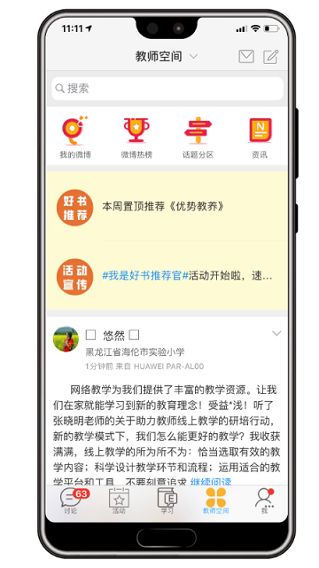 发布话题:在教师空间中点击号即可查看相关话题,点击号内容,也可发布话题。
