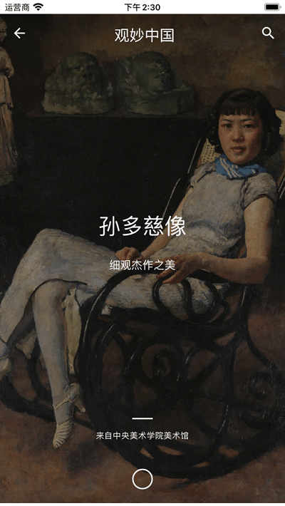 观妙中国ios版是一款艺术作品软件,在平台上面有着十分多的中国艺术画,能够给用户展示中国文化艺术作品,让用户们能够欣赏到许多的画像,同时还能让用户了解到每个画像背后的故事,培养自己的艺术情操,欣赏中国艺术之美,感兴趣的朋友们快来下载体验吧!