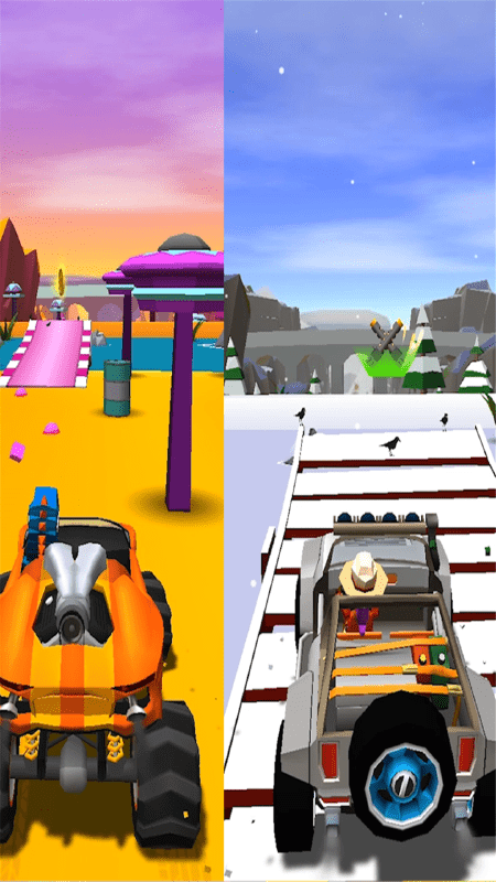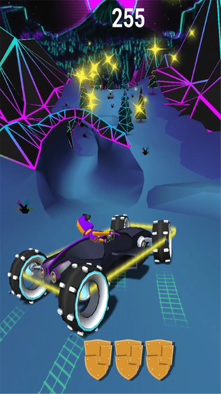 1.不断的闪避并且吃金币,直到你失败或者来到终点,游戏有点像是伪装成赛车的跑酷类手游,