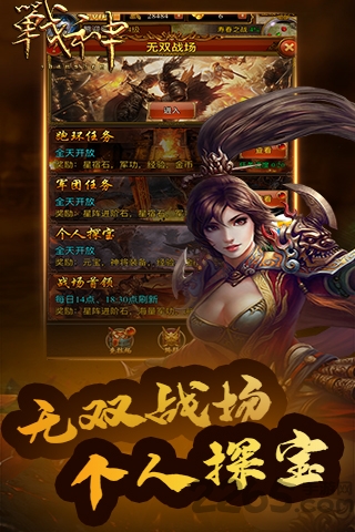 类三国题材游戏,在游戏中你可以征战各种武将BOSS,进入游戏之后有机会获得满级Vip特权,不充值也可以氪金,装备资源、钱币奖励都很丰富,想玩就加入!每日签到,只要上线签到,就可以免费领取神坐骑、法宝、神将应有尽有。商城礼包全面调整,让平民也能玩嗨!
