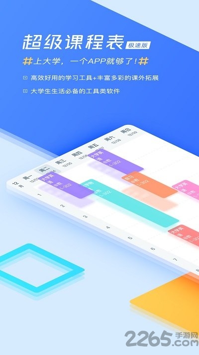 超级课程表极速版苹果版是一款教育学习类生活软件,软件旨在为学生提供便捷的学习帮助服务,通过软件学习可以很方便很清楚的了解每天的上课时间和课程安排,为学生提供最便捷的学帮助,感兴趣的快来2265安卓网下载体验吧!