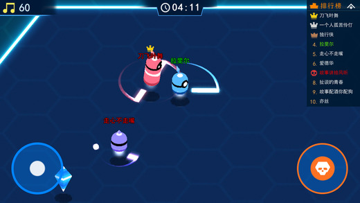 游戏操作采用了比较流行的摇杆加按键的组合模式,我们通过屏幕左下方的摇杆进行走位控制,右下角的按钮则可以开启主角的特殊技能,加速身边刀刃的旋转,用以和敌人进行对拼。本作的操作还是非常顺畅的,按钮的位置和大小都比较合适,控制起来人物走位灵活,使用技能的时候有一种虎虎生威的感觉,让人情不自禁激动不已。