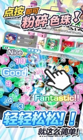 只要透过点按的简单操作就可以体验到最高级的「爽快感」。只要1次点按就可以连锁粉碎色珠。超华丽效果的粉碎技能、一发逆转的狂热模式等,多样化的系统让你感受更多的爽快感!