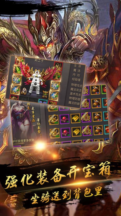 变态私服、怒刷BOSS:狂爆神装,稀有神装唾手可得,保值不掉价。神装加身,主宰沙城,成就传奇霸业!
