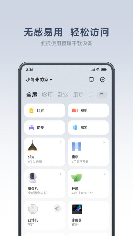 小米智能家庭苹果版是一款便捷安全的智能服务软件,专为用户提供关灯、扫地、操作设备等等功能,只需一部手机即可完成操作,非常强大的智能产品,喜欢的话就来2265安卓网下载吧!