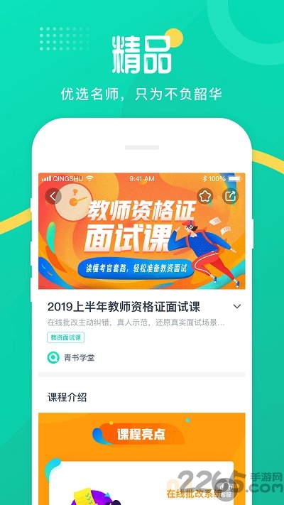 数百万学生正在使用的线上学习平台,不论你是想提升学历拿文凭,还是想提升能力拿证书,青书学堂统统满足你!教师资格证考试各个科目(语数外体美幼)全面覆盖,根据星级攻克每一个知识点,笔试与面试通过视频·音频·课件·讲义等全面备考。为200万学生提供及时高效的在线服务,包括线上电子书、在线直播录播、教师资格证笔试面试课程等等,致力于打造中国更专业的线上教育综合性平台。