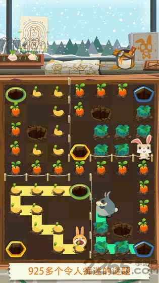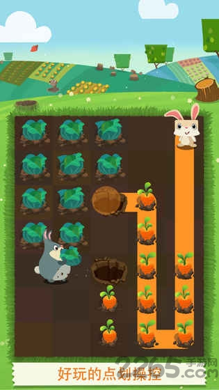 3.本作的玩法很简单,玩家要以小兔子为起点,用手指在关卡中画出一条路线,让小兔子既能吃掉所有萝卜又能顺势逃回地洞就可以了。但需要注意的是,玩家在画线时只能往横和竖两个方向画,而且还不能重复经过同一个萝卜,只有画出一条不重叠、不交叉的路线,才能帮助小兔子一次性将农田中的胡萝卜全部吃完。