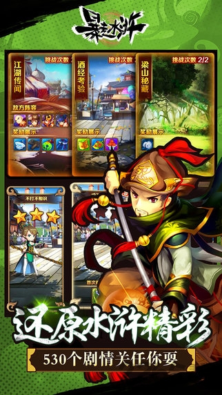 水浒一零八将才,梁山明堂齐聚义,指天地为父母,认星辰作兄弟,辨恩仇见忠心,动江湖凭义气!《暴走水浒》530个游戏关卡带你全程回忆那个热血重情的故事情节!