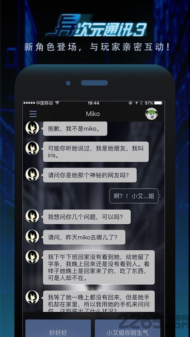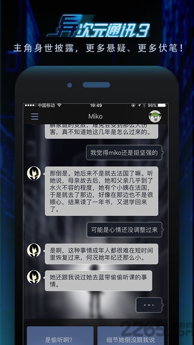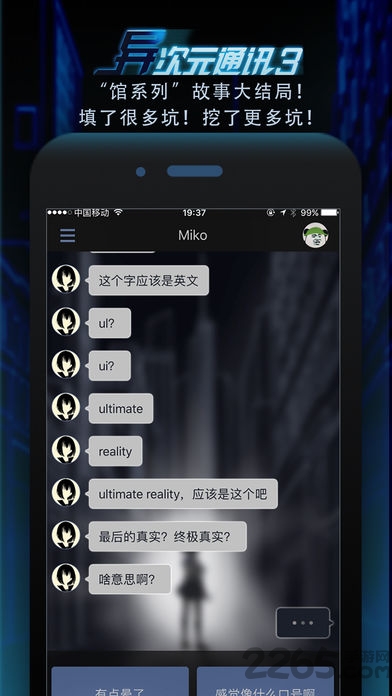 异次元通讯苹果版是日系风格的少女冒险解密文字游戏,一个被追杀的少女在逃亡途中只能经过短信和你沟通,玩家需要在文字交流的过程中了解事情的始末以及帮助少女逃脱追杀,感兴趣的玩家快来2265安卓网下载吧!