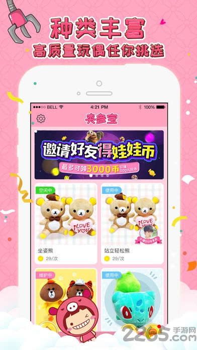 【夹多宝】是欢乐有趣的线上抓娃娃游戏app,2265用户可以通过app来真实地享受商场夹娃娃机的精彩体验,足不出户即可抓娃娃,随时都可抓,并且抓到的奖品会寄到指定地址,体验感完美顺滑哟~