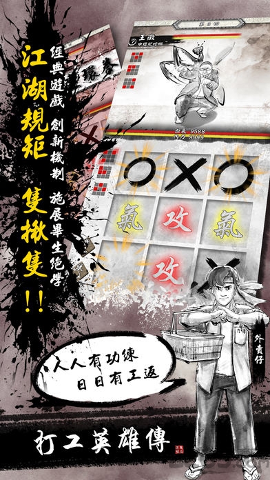 战斗系统改良经典小游戏井字过三关,丰富其策略性,对弈时要谨慎取舍攻击或防守,事前亦是配搭好武功及内功,依靠机智取胜!