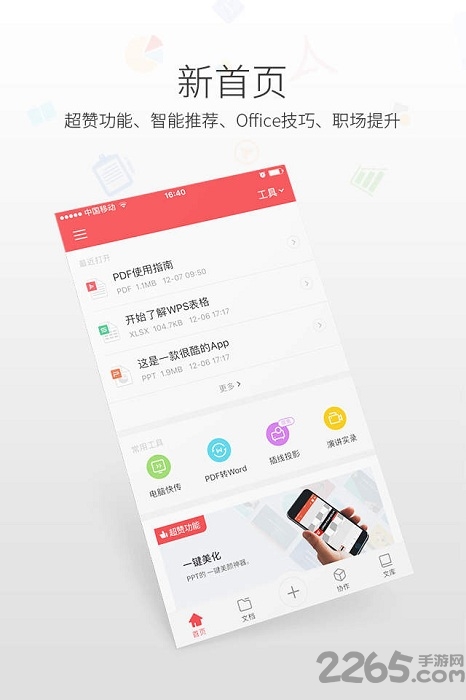 演讲实录,手机遥控,共享播放,无线投影,自动换行...千余专利保护技术,打造WPS专属移动办公新体验。