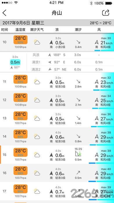 支持一周内天气查询和海况预报,直观并详尽地展示一天之内每隔1个小时的天气状况,包括温湿度、气压、降水量、风向、风力、浪高等内容。根据季节、日照时间、潮汐情况以及月相共同作用得出鱼类活动趋势,为用户的出行计划提供参考。