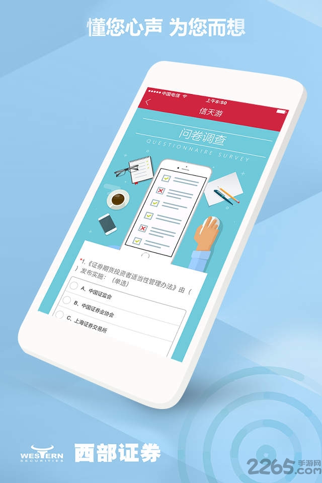 信天游手机证券3.0iPhone版是一款新一代手机证券软件,拥有行情、理财、资讯、开户、交友等基础功能,为广大投资者提供最专业、最高效的一站式财富管理服务,欢迎有需要的朋友来2265安卓网下载。