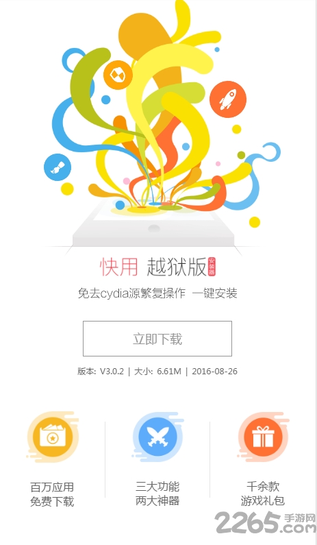 快用苹果助手iphone版是一款非常不错的手机应用游戏下载辅助软件,专为苹果用户量身打造的应用游戏下载神器,手机不用越狱,不需要iTunes也能一键下载,安全便捷,快来2265安卓网点击下载体验一下吧!