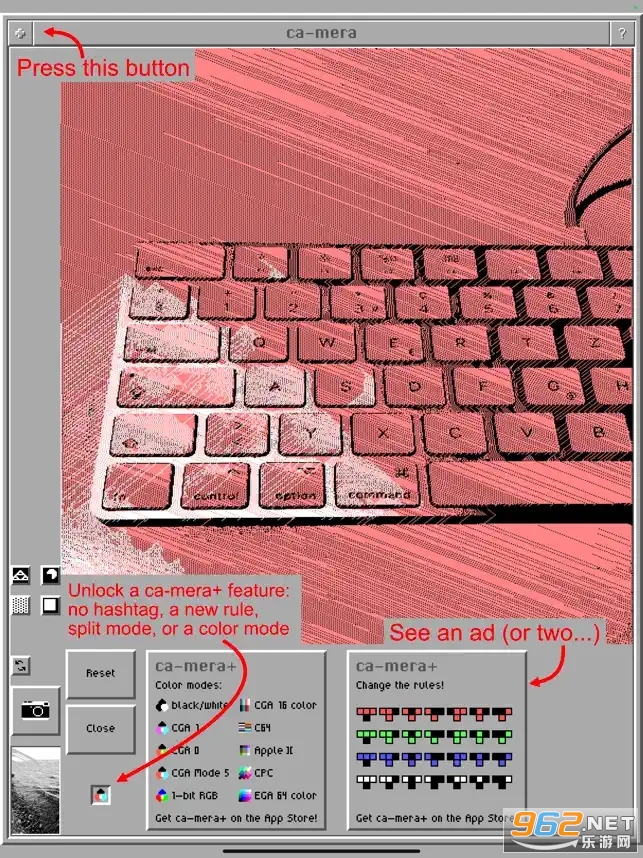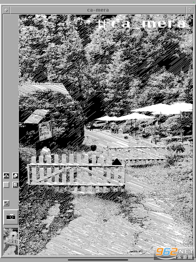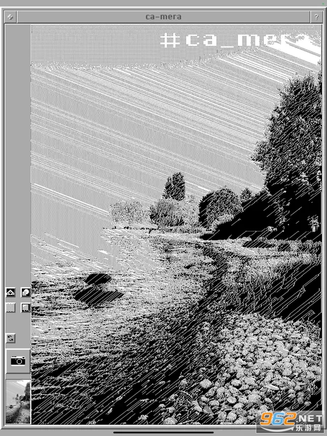 ca-mera可能是有史以来最书呆子的相机应用程序,它使用细胞自动机来解释相机流的亮度值。所得到的图像是黑/白和像素化的,并且包含由元胞自动机创建的独特图案(Wolfram规则126)。