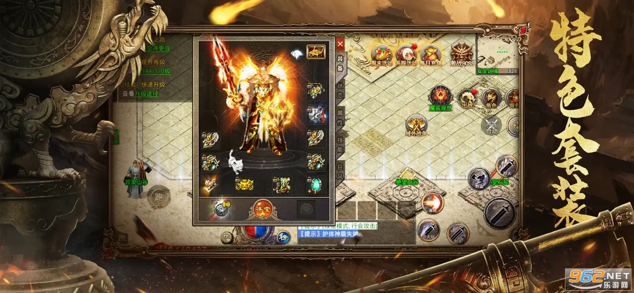 掉落的装备除了低层级套装之外,还会产出开天套装(开天,凤天魔甲,凰天魔衣)以及战神系列套装。